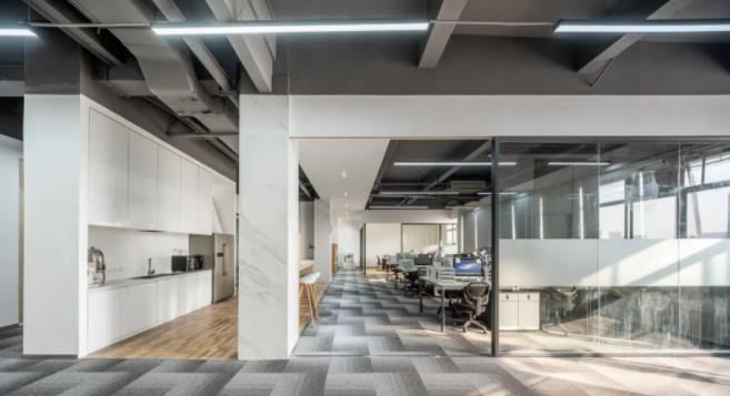 2、協(xié)作與可持續(xù)理念相結(jié)合的開(kāi)放式辦公室設(shè)計(jì):天花設(shè)計(jì)富有特色,由白色穿孔金屬板彎折出具“通風(fēng)”功能的裝飾吊頂。光澤的金屬質(zhì)感與粗獷的黑色原始建筑頂面形成強(qiáng)烈的視覺(jué)反差。新舊的對(duì)比、色彩的對(duì)比、質(zhì)感的對(duì)比、簡(jiǎn)練的設(shè)計(jì)結(jié)合當(dāng)下潮流靈動(dòng)辦公理念,成功塑造出一個(gè)具專業(yè)氣質(zhì)的時(shí)尚辦公空間。